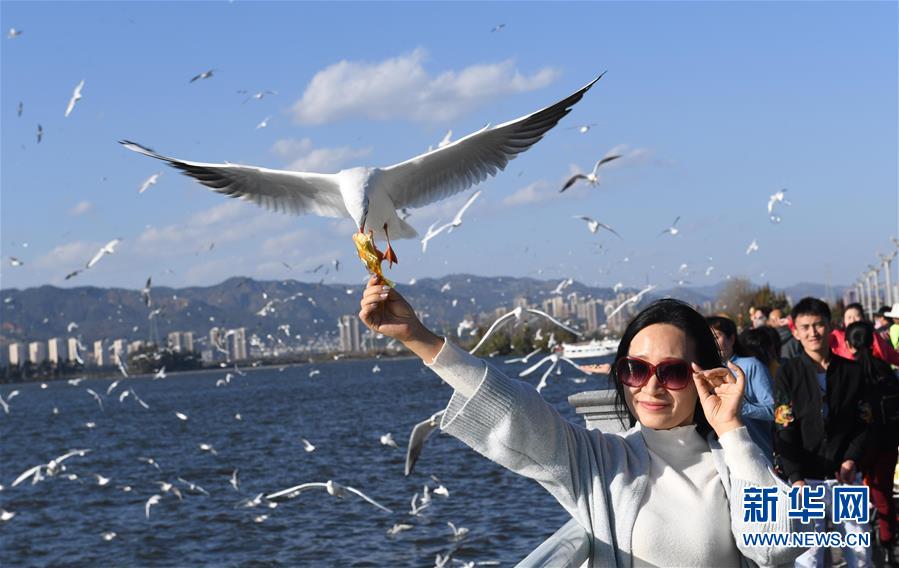 11月19日,游客在昆明滇池海埂大坝给红嘴鸥喂食。 新华社记者杨宗友摄