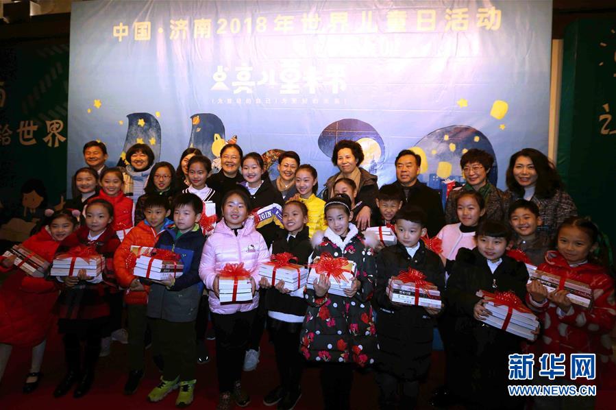 11月20日,在济南举行的世界儿童日主题活动上,孩子们拿着获赠的经典书籍合影留念。 新华社发(李俊卓摄)