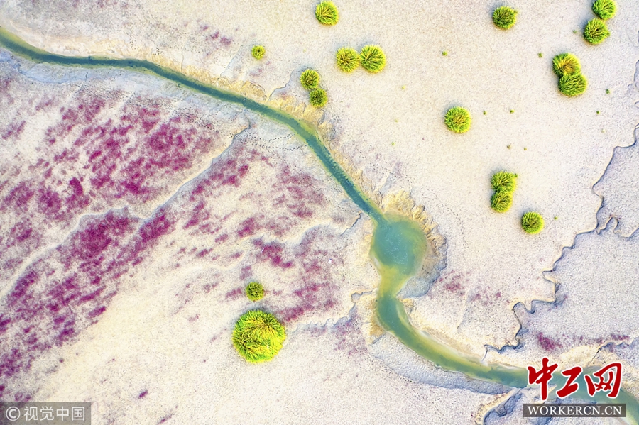 2018年11月11日,青岛,航拍洋河入海口湿地,红色碱蓬草和绿色的大米草分布在河道的两岸。作者 刘宝喜 图片来源:视觉中国