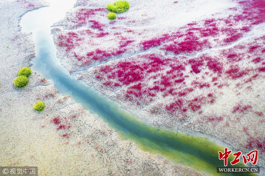 2018年11月11日,青岛,航拍洋河入海口湿地,红色碱蓬草和绿色的大米草分布在河道的两岸。作者 刘宝喜 图片来源:视觉中国