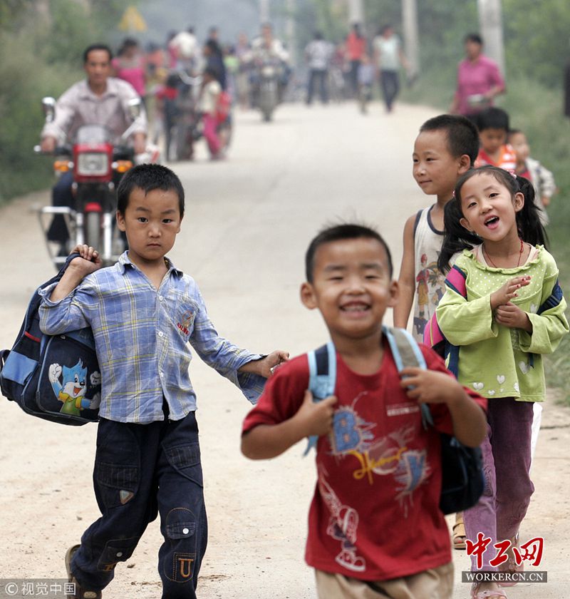 2006年12月27日,河南三门峡,豫西卢氏山区横涧乡南窑村修通了水泥路,孩子们上学时走在宽敞的大路上别提多兴奋了。(图片来源:视觉中国 请勿转载)