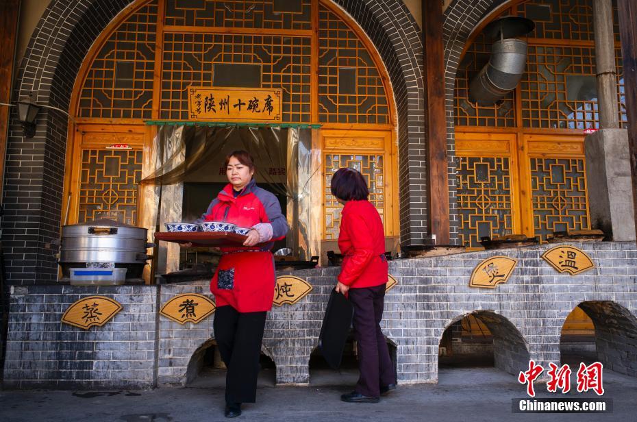 河南省三门峡市陕州区的饭馆服务员正在当地传统特色的穿山灶前传菜。中新社记者 侯宇 摄