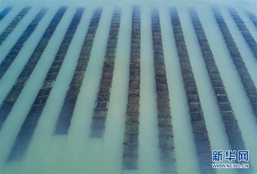 近日,福建省各地陆续进入紫菜采收季节。在福建省石狮市,待收的紫菜在涨潮的海面上若隐若现,形成独特的景观。 新华社记者 宋为伟 摄