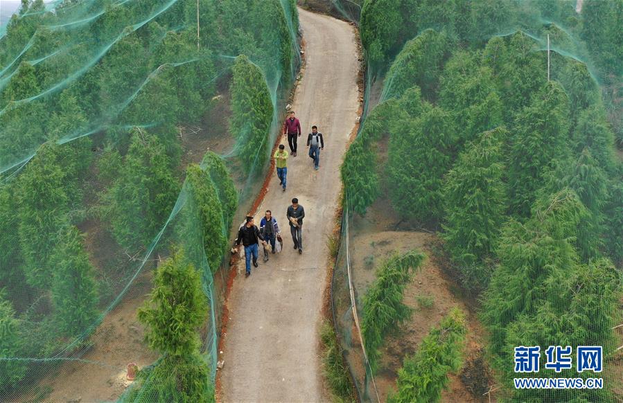 10月21日,几位客商来到养殖基地购买七彩野山鸡(无人机拍摄)。新华社发(胡攀学 摄)