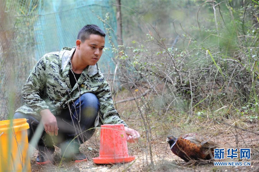 11月21日,姚林在养殖基地给七彩野山鸡投食。新华社记者 杨楹 摄