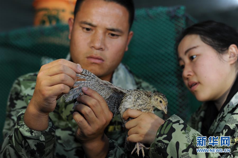11月21日,姚林(左)在养殖基地查看小鸡的生长情况。新华社记者 杨楹 摄