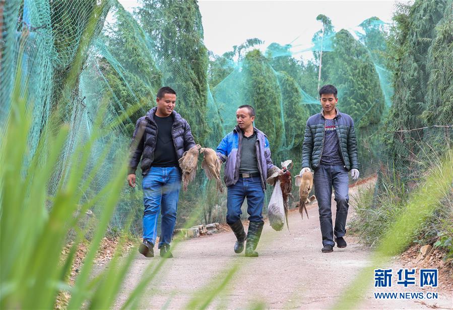 10月21日,几位客商来到养殖基地购买七彩野山鸡。新华社发(胡攀学 摄)