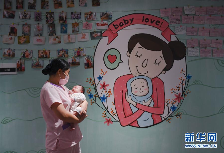 11月21日,在福建省石狮市一家月子中心,护理师抱着新生儿走过一面照片留言墙。新华社记者 宋为伟 摄