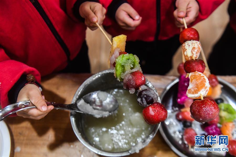 11月21日,孩子们在老师的带领下用桔子、山楂等水果制作糖葫芦。新华社记者 徐昱 摄