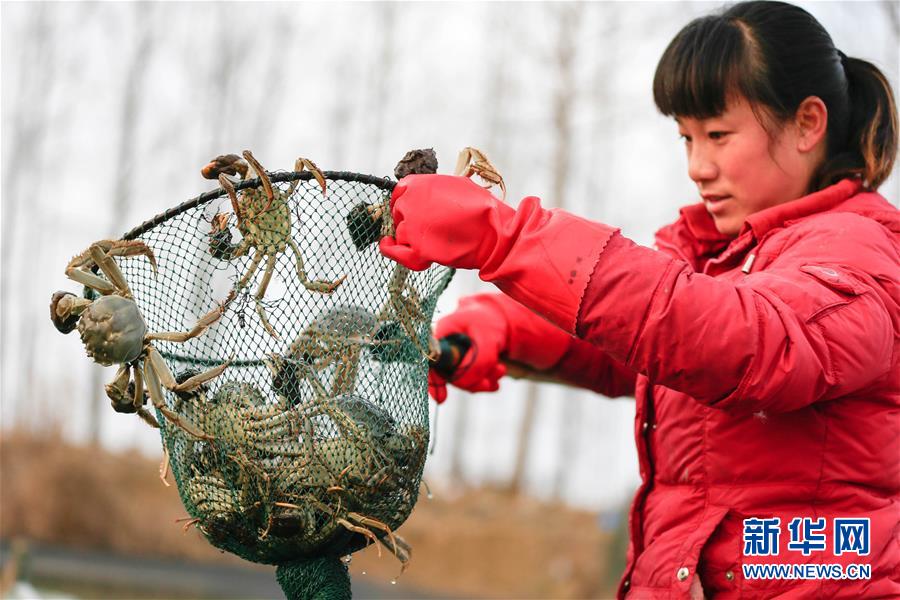 11月21日,在江苏省盱眙县淮河镇养蟹基地,蟹农在捕捞大闸蟹。新华社发(周海军 摄)