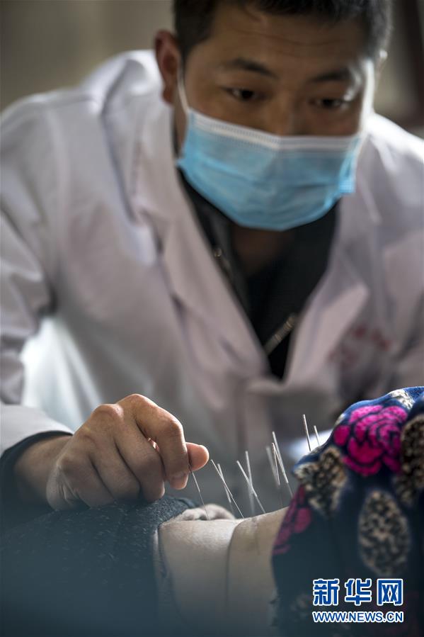 11月21日,在宁强中医医院巴山分院,董飞在为病人针灸治疗。董飞与同事们一起,为分院建起了针灸理疗科,每天都接收不少患者。 新华社记者陶明摄