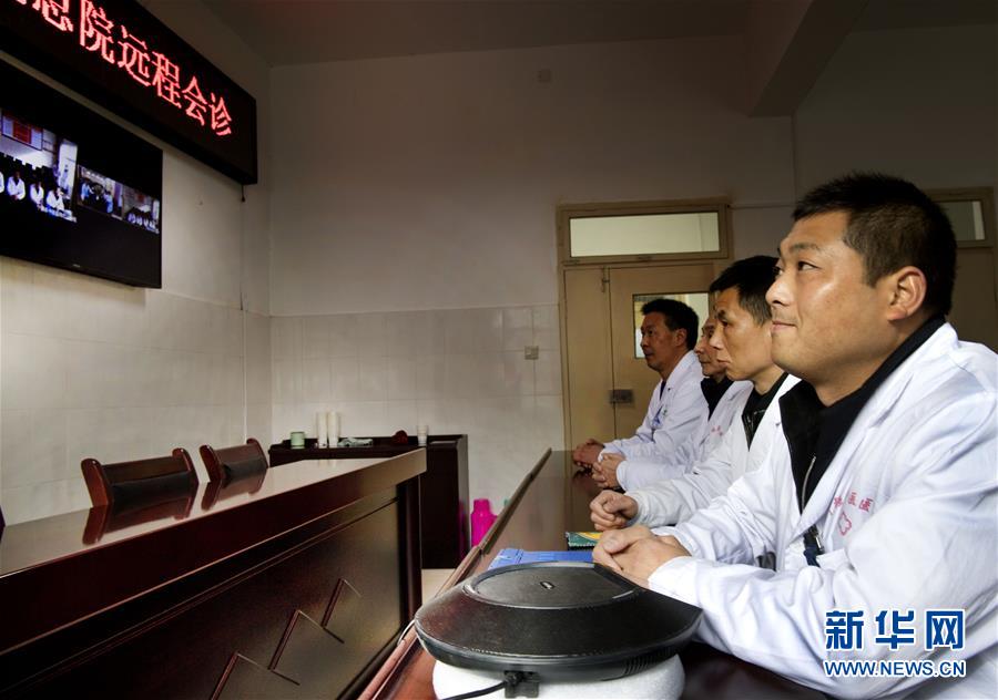 11月21日,在宁强中医医院巴山分院,董飞(右一)和同事们在远程会诊室同宁强县中医医院专家会诊病人病情。利用远程技术,一些急、难症患者在“家门口”享受到二级三级医院坐诊专家的有效诊治。 新华社记者陶明摄