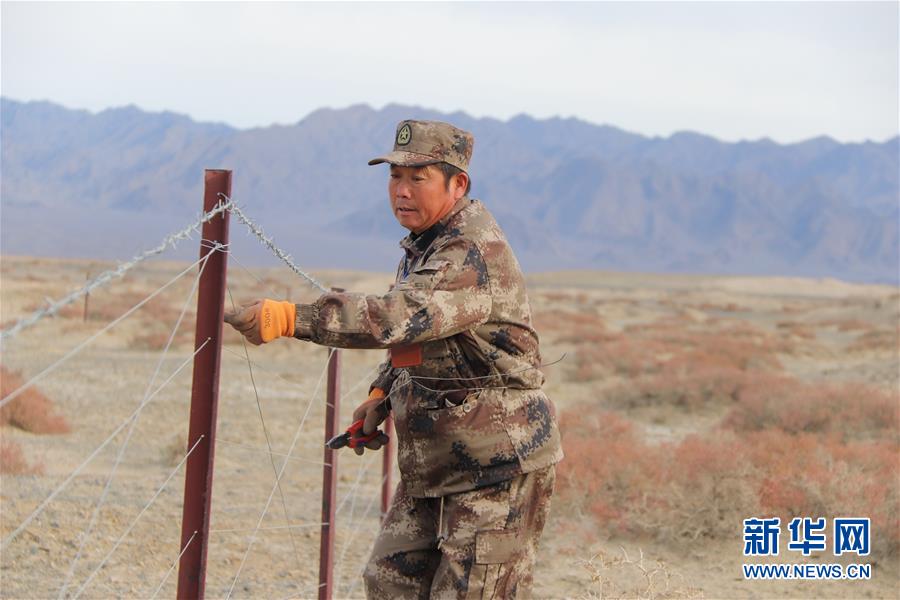 在新疆哈密市七角井镇七角井村的老村附近,赵金闪在修复荒漠林围栏(11月2日摄)。新华社记者孙哲摄