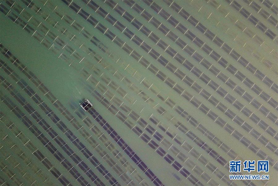 11月22日,在连云港市赣榆区石桥村,养殖户在采收头茬条斑紫菜(无人机拍摄)。