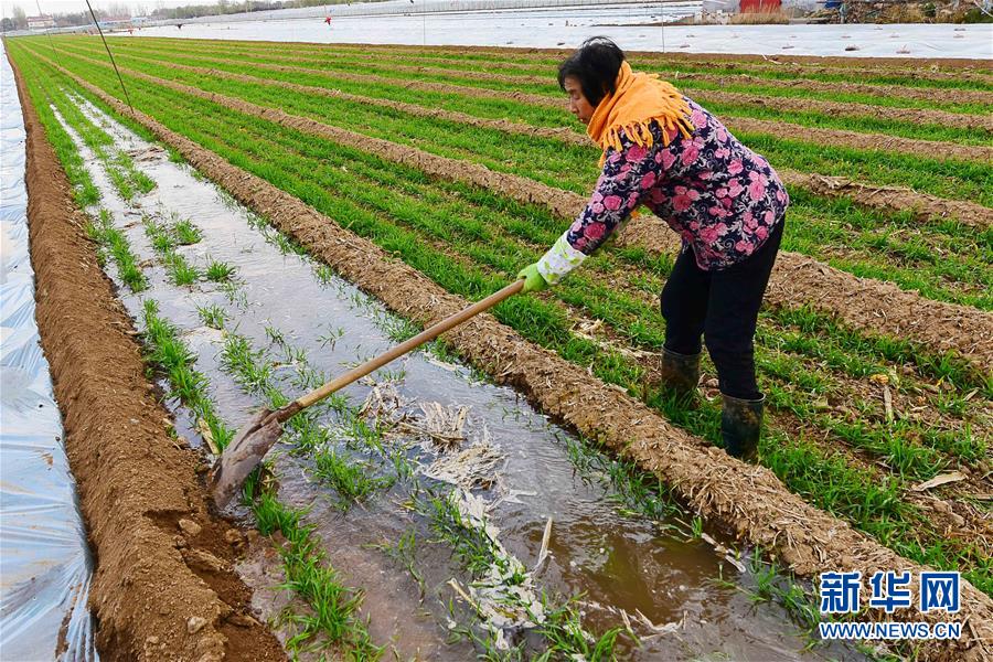 11月22日,山东省青州市东夏镇拾甲村农民在引水浇灌冬小麦。 当日是二十四节气中的小雪,各地农民做好采收、御寒、管理等工作,确保冬季农业生产顺利进行。 新华社发(王继林 摄)