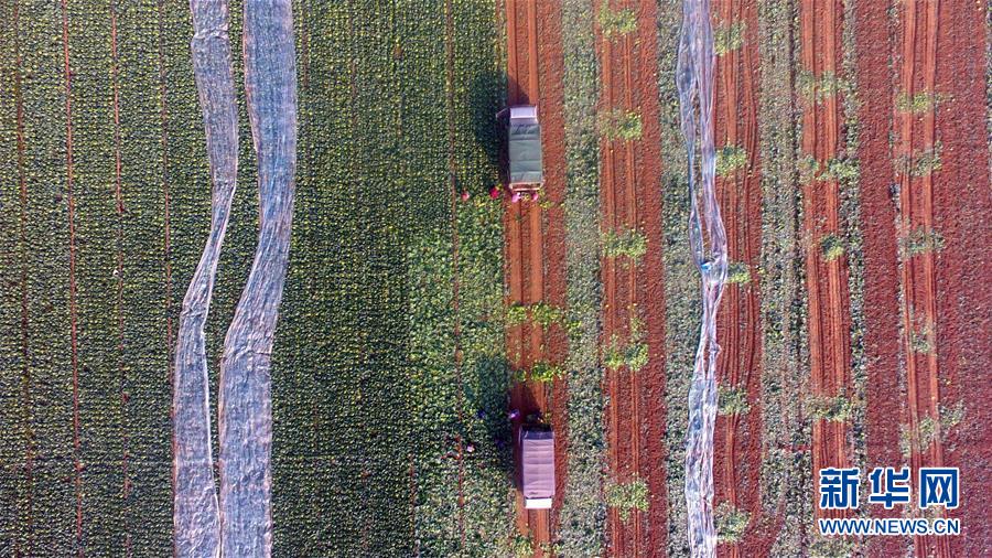 11月22日,山东省聊城市茌平县贾寨镇邢胡刘村村民在收获甘蓝(无人机拍摄)。 当日是二十四节气中的小雪,各地农民做好采收、御寒、管理等工作,确保冬季农业生产顺利进行。 新华社发(赵玉国 摄)