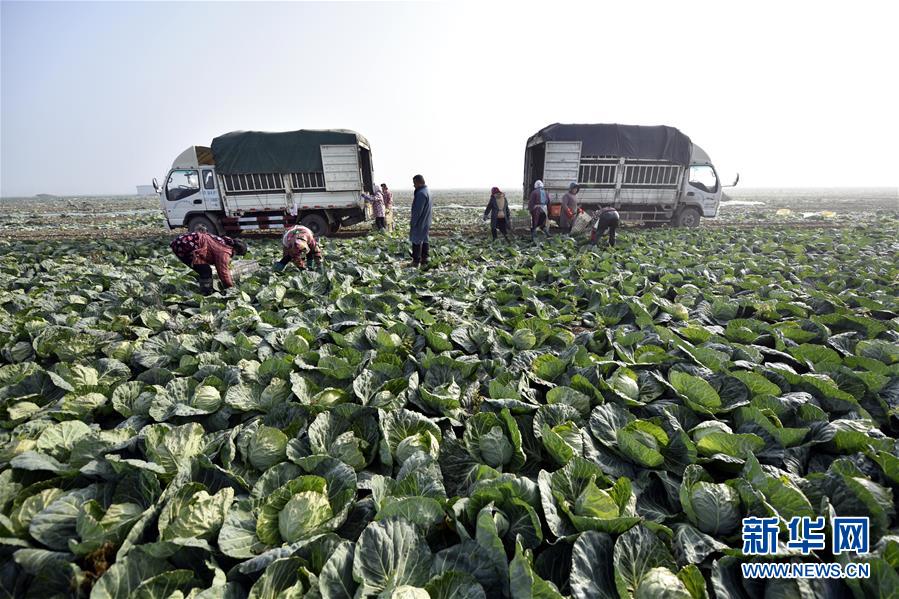 11月22日,山东省聊城市茌平县贾寨镇邢胡刘村村民在收获甘蓝。 当日是二十四节气中的小雪,各地农民做好采收、御寒、管理等工作,确保冬季农业生产顺利进行。 新华社发(赵玉国 摄)