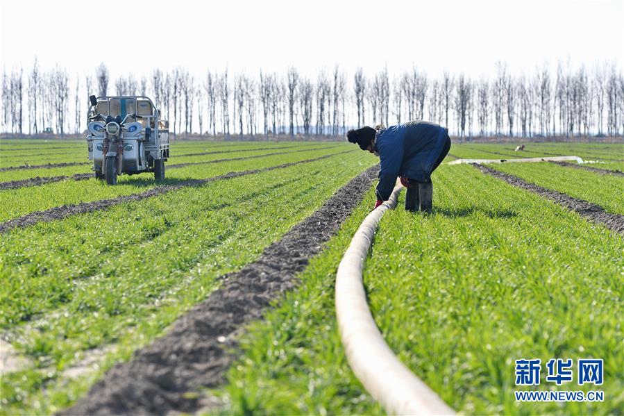 11月22日,河北省滦州市茨榆坨镇李塔坨村农民在麦田内浇灌封冻水。 新华社记者 牟宇 摄