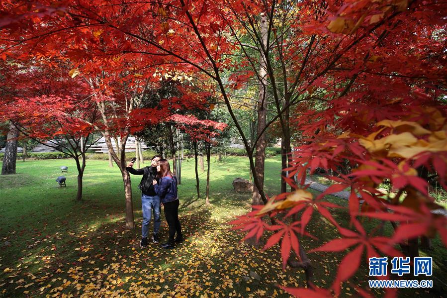 11月22日,游人在湖南省张家界市武陵源区黄龙洞风景区一处枫林中自拍。