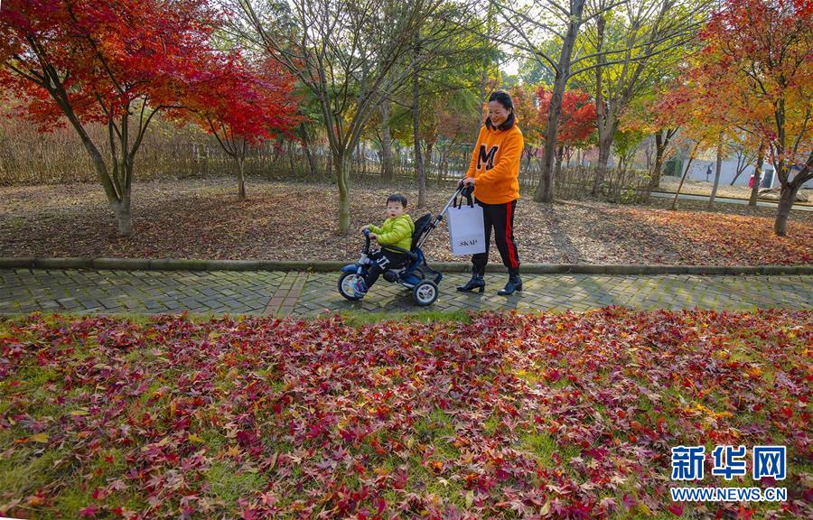 11月22日,市民在江苏省宿迁市泗洪县街头的枫树林游玩。 新华社发(张连华 摄)