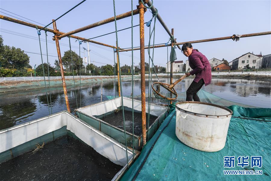11月22日,合作社的社员在河塘内捕捞成熟的河蟹。新华社记者 徐昱 摄