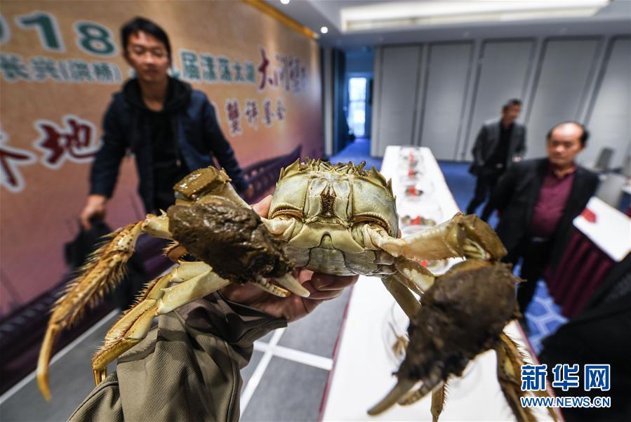 11月22日,在河桥镇河蟹合作社举办的河蟹评选会上,工作人员展示参评的河蟹。新华社记者 徐昱 摄