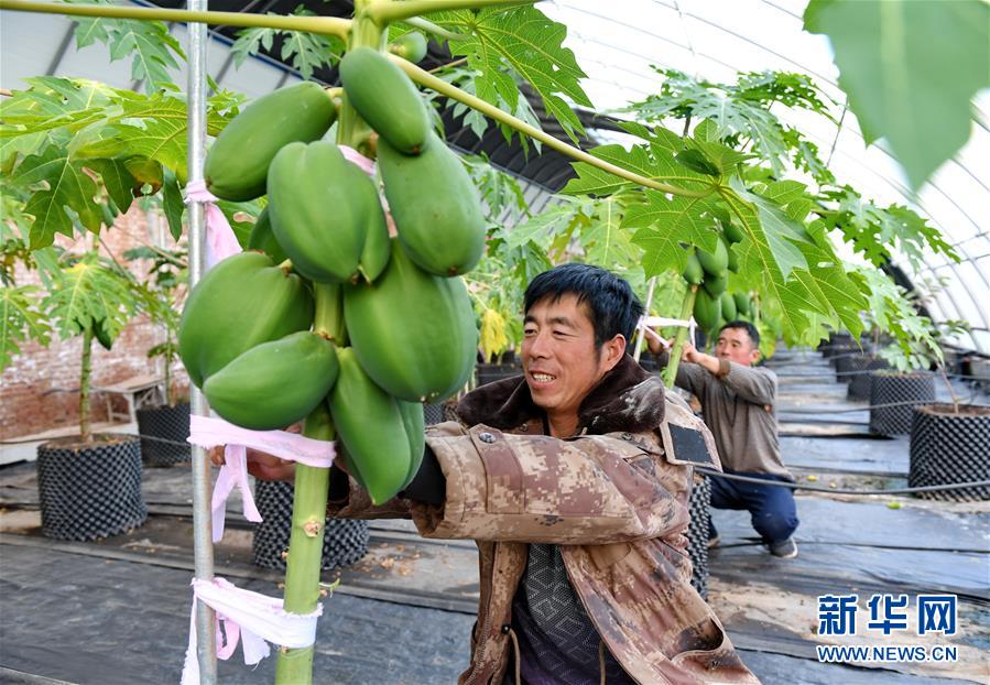 11月22日,农民在滦州市鸡冠山生态农业产业园日光温室内打理种植的木瓜。