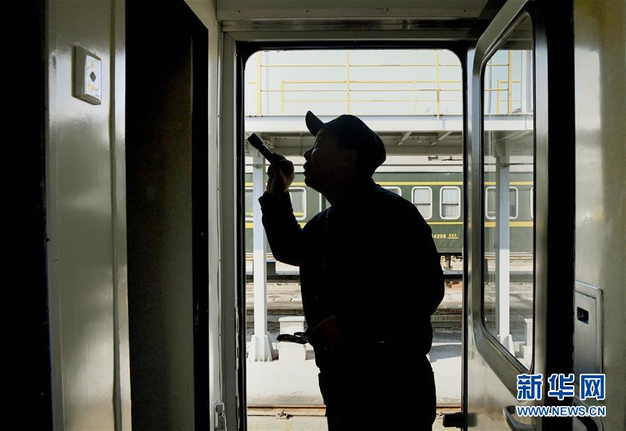11月22日,张军富在检查锅炉外观状态及烟囱与车顶板结合部是否密封良好。 新华社记者李安摄