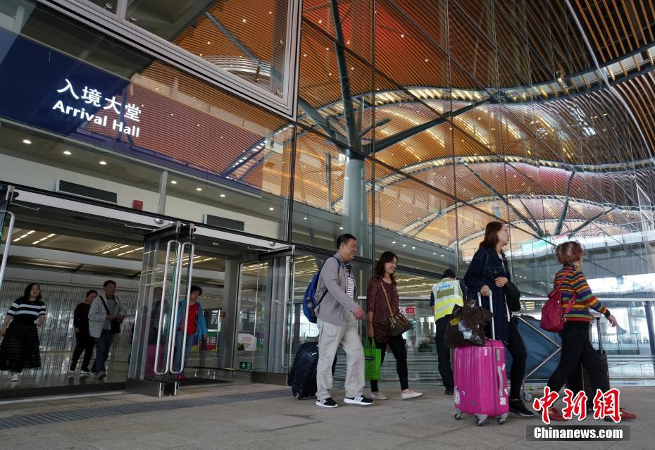 11月23日,港珠澳大桥开通至今刚满一个月,大桥香港口岸旅检大楼秩序井然。图为游客走出大桥香港口岸旅检大楼准备前往香港市区旅游。中新社记者 张炜 摄