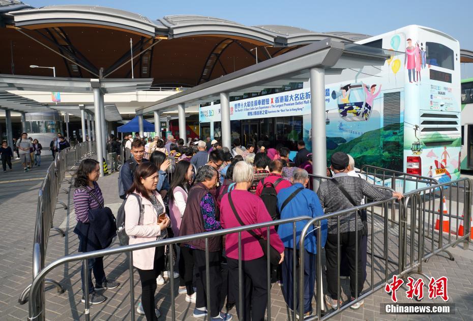 11月23日,港珠澳大桥开通至今刚满一个月,大桥香港口岸旅检大楼秩序井然。图为刚刚抵达口岸的内地游客排队搭乘B6公交巴士前往东涌。自从实施分流措施后,前往东涌的旅客有所减少。中新社记者 张炜 摄