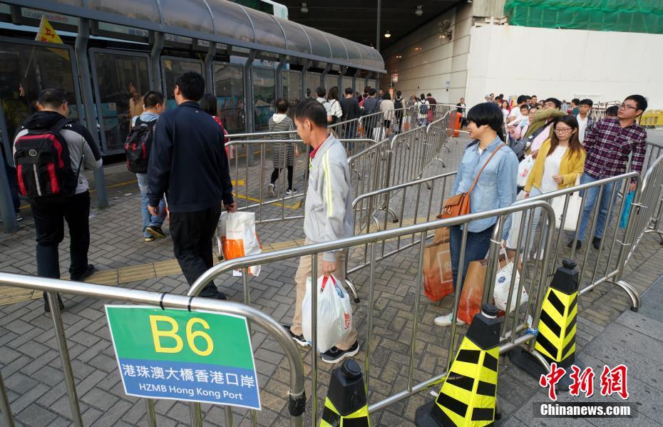 11月23日,港珠澳大桥开通至今刚满一个月,距离港珠澳大桥香港口岸最近的商圈东涌市中心秩序比通车初期明显改善。图为返程的内地游客正在东涌排队搭乘B6巴士前往大桥香港口岸。中新社记者 张炜 摄