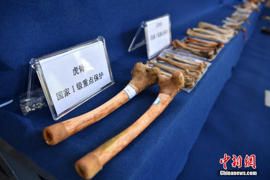 11月23日,警方查获的虎骨。当日,昆明市森林公安局向媒体通报,破获一系列特大非法收购出售珍贵濒危野生动物及其制品案件。截止目前,共查获被犯罪嫌疑人收购、出售的辐射陆龟、雪豹皮、虎骨、犀牛角等珍贵、濒危野生动物及制品702件(只),涉案价值370余万元人民币。专案组共抓获犯罪嫌疑人22人,立刑事案件24起,已移送审查起诉18起,其余案件正在侦办中。中新社记者 刘冉阳 摄