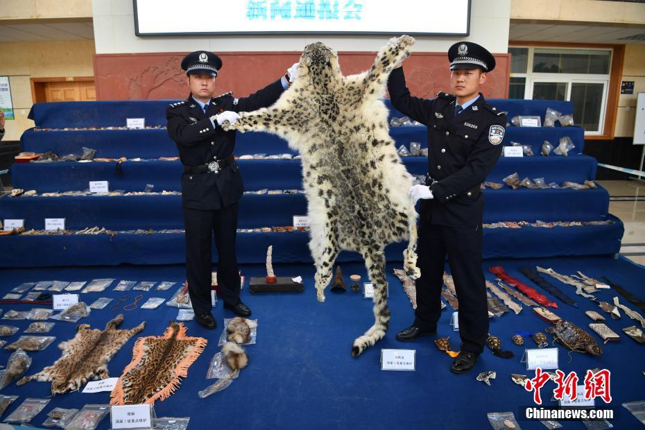 11月23日,警方展示查获的雪豹皮。当日,昆明市森林公安局向媒体通报,破获一系列特大非法收购出售珍贵濒危野生动物及其制品案件。截止目前,共查获被犯罪嫌疑人收购、出售的辐射陆龟、雪豹皮、虎骨、犀牛角等珍贵、濒危野生动物及制品702件(只),涉案价值370余万元人民币。专案组共抓获犯罪嫌疑人22人,立刑事案件24起,已移送审查起诉18起,其余案件正在侦办中。中新社记者 刘冉阳 摄