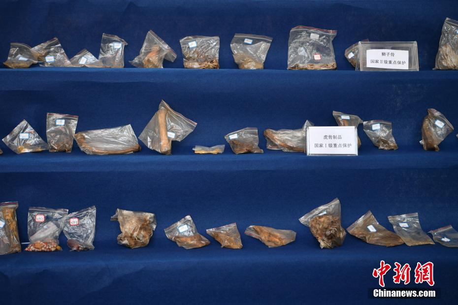 11月23日,警方查获的虎骨制品。当日,昆明市森林公安局向媒体通报,破获一系列特大非法收购出售珍贵濒危野生动物及其制品案件。截止目前,共查获被犯罪嫌疑人收购、出售的辐射陆龟、雪豹皮、虎骨、犀牛角等珍贵、濒危野生动物及制品702件(只),涉案价值370余万元人民币。专案组共抓获犯罪嫌疑人22人,立刑事案件24起,已移送审查起诉18起,其余案件正在侦办中。中新社记者 刘冉阳 摄