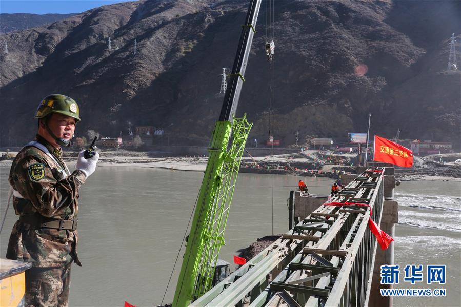 当日12时40分,经武警某部交通三支队官兵连续奋战,被金沙江白格堰塞湖泄洪冲毁的金沙江大桥成功吊装起第一跨,这标志着318国道抢通取得突破性进展。