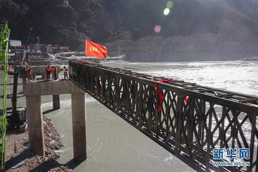 当日12时40分,经武警某部交通三支队官兵连续奋战,被金沙江白格堰塞湖泄洪冲毁的金沙江大桥成功吊装起第一跨,这标志着318国道抢通取得突破性进展。