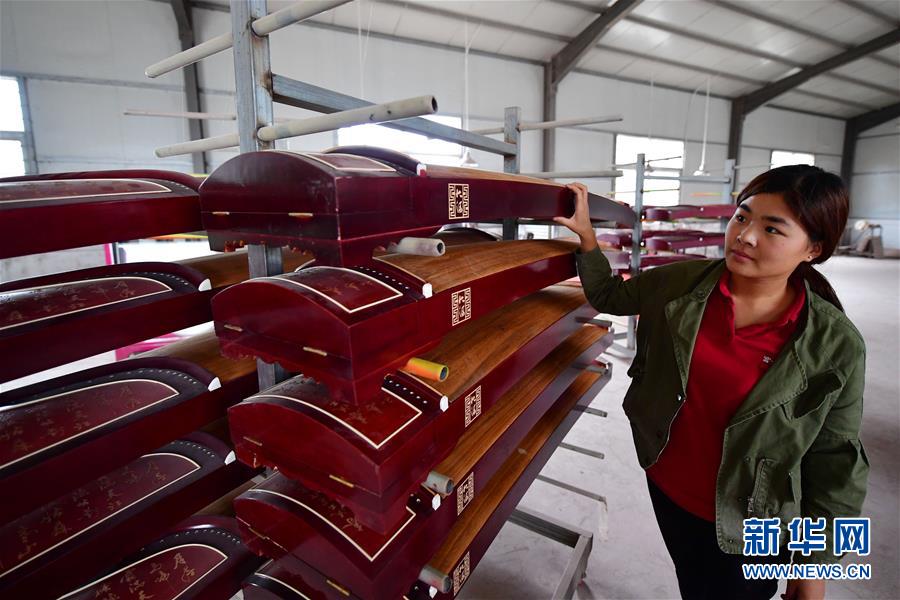 在兰考堌阳镇大河乐器厂,一位工人查看刚上过漆正在晾晒的古筝(2017年9月4日摄)。新华社记者 冯大鹏 摄