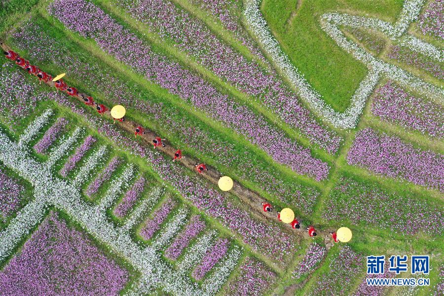 广西百色市德保县城关镇那温村村民在花海中行走(11月27日无人机拍摄)。近日,广西百色市德保县城关镇那温村连片花海陆续盛开,吸引了众多游客。新华社记者 周华 摄