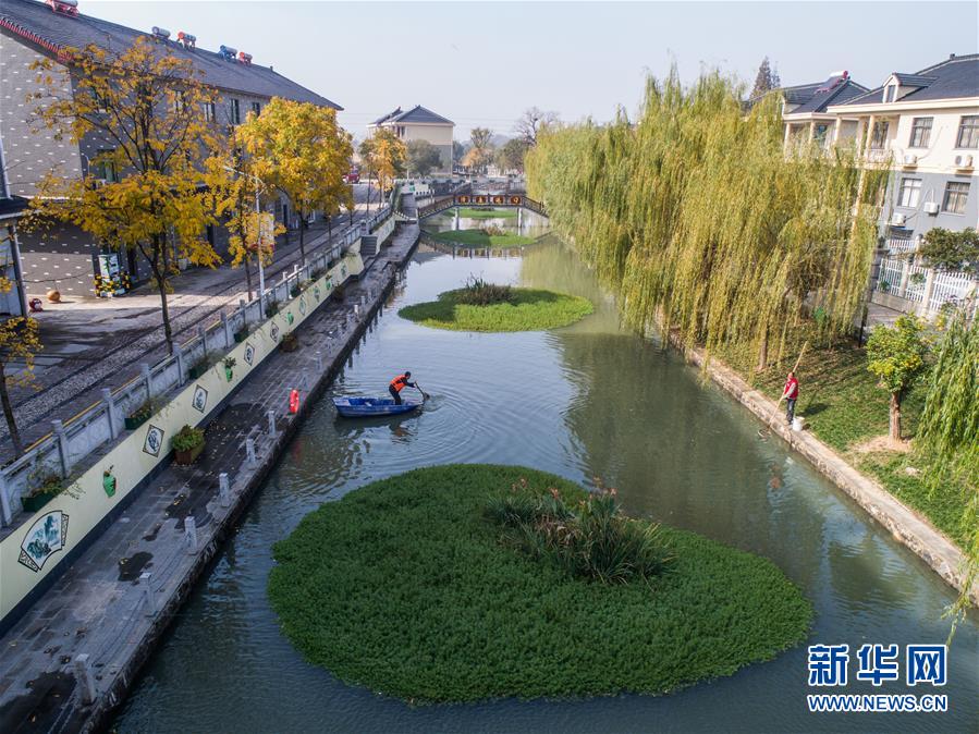 11月28日,长兴县虹星桥镇港口村东港内,河长孙根法在打捞水面漂浮物(无人机拍摄)。东港全长1500米,环绕港口新村。2012年,新村建成后,港口村通过加固河岸、清理河道、种植浮草等方式对东港进行生态治理,并由该村党总支书记孙根法担任河长,定期开展巡查,引导村民自觉维护河道整洁。 新华社记者 徐昱 摄