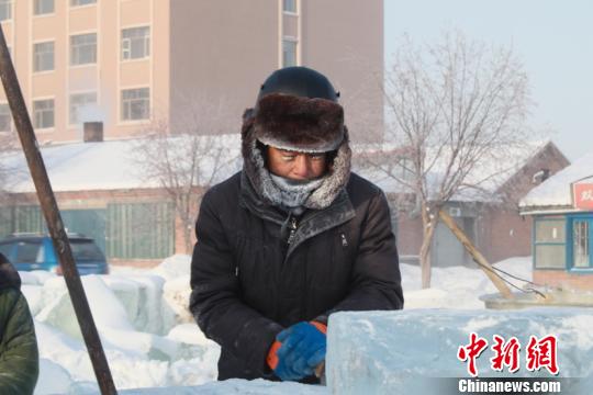 冰雕工人冒着严寒在室外制作冰雕。(王景阳 摄)
