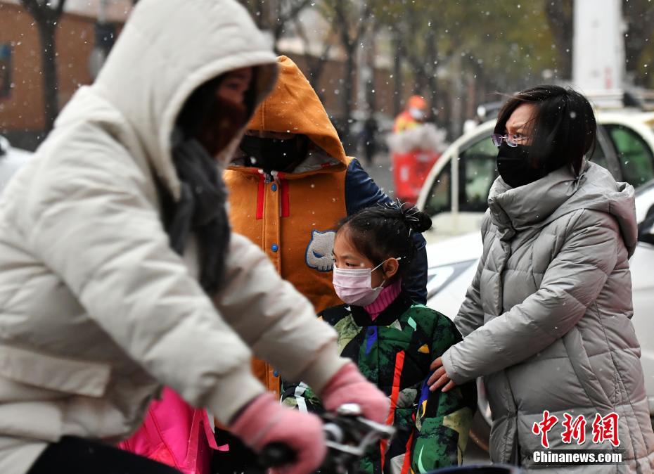12月5日,河北石家庄,降雪天气影响市民出行。据了解,受较强冷空气影响,今日起未来三天,该省各地最低气温将明显下降,降温幅度普遍在6~8℃之间,其中北部地区局地可达8~12℃。图为市民“捂装”出行。 中新社记者 翟羽佳 摄