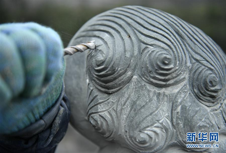 12月5日,在湖北省宣恩县椒园镇龙洞村,一名“岩匠”在石雕动物上雕刻纹理。