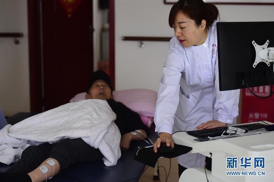 12月5日,泊头市福星园老年公寓的护理人员帮助失能老人进行理疗。