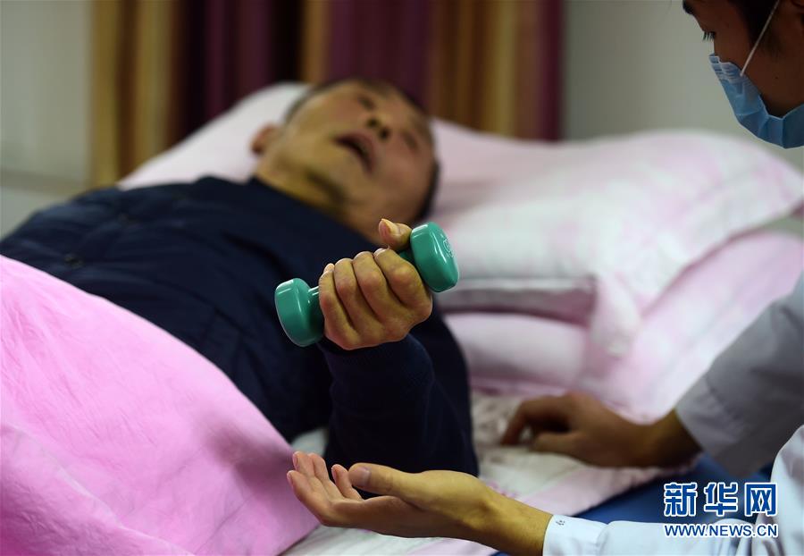 12月4日,泊头市福星园老年公寓的护理人员帮助失能老人进行康复训练。