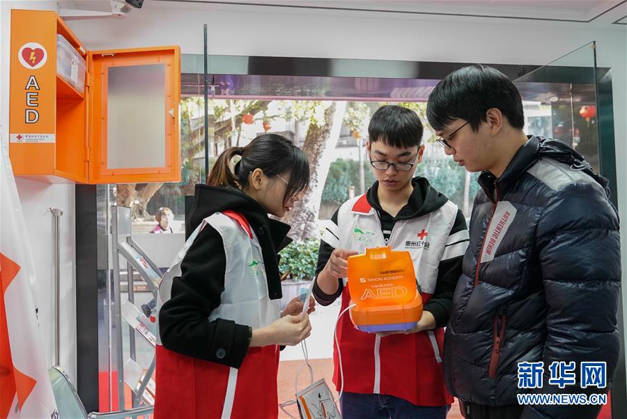 12月14日,在广东省惠州市西湖景区红十字救护站,志愿者向游客介绍自动体外除颤仪。
