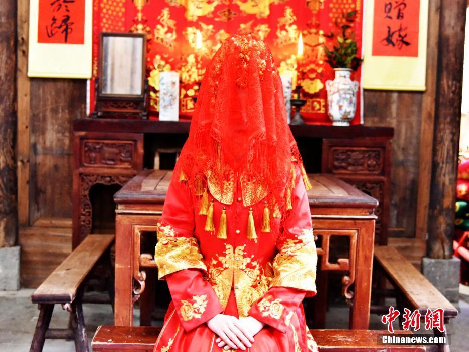 12月16日,北方地区大量游客来到江西婺源篁岭古村。当地准备了一场传统嫁娶婚俗表演,带领游客全程体验古徽州婚俗的魅力。当日,接亲队伍按照传统的徽州婚俗,抬着花轿、吹着唢呐、敲着锣鼓,欢欢喜喜地将新娘的花轿抬往新郎家,“新人”不时向游客抛喜糖,现场喜气洋洋,热闹非凡。婚房中拜天地、拜高堂、掀盖头、撒粿籽等环节,真实再现了徽州传统婚俗。方华彬 摄