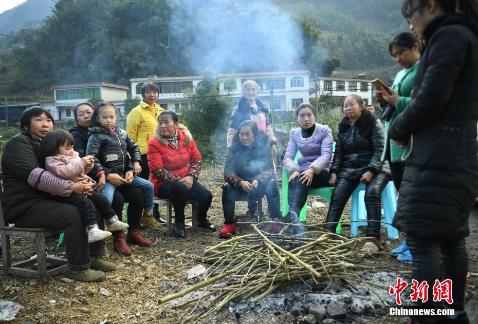 12月17日,四川兴文,受灾严重的洛浦村村民围坐一起烤火取暖。四川兴文5.7级地震造成震区部分山体垮塌和民房受损,相关工作人员已深入震中进村入户核查具体情况。中新社记者 刘忠俊 摄