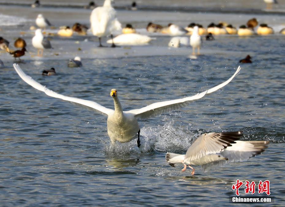 12月17日,新疆巴州库尔勒市杜鹃河面上热闹非凡,美丽的天鹅、成群的野鸭、飞翔的海鸟一同在杜鹃河中嬉戏打闹、时而飞翔觅食、时而翩翩起舞,犹如美丽的舞者,勾勒出一幅人与自然和谐共处的美丽画卷。据了解,每年的初冬时节来自远方的天鹅、野鸭等候鸟都会选择来到这里越冬。罗兴仓 摄