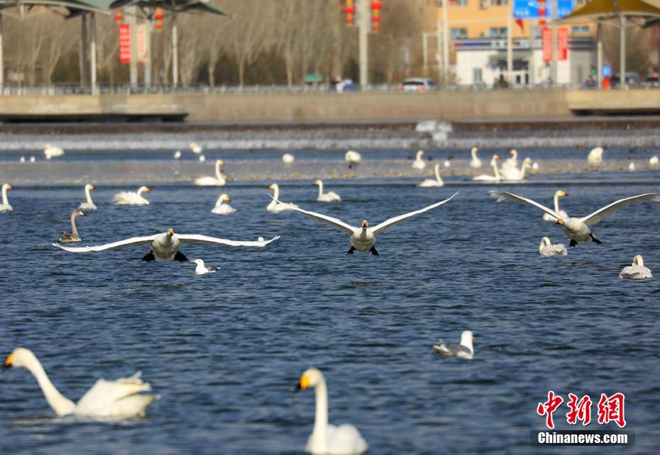 12月17日,新疆巴州库尔勒市杜鹃河面上热闹非凡,美丽的天鹅、成群的野鸭、飞翔的海鸟一同在杜鹃河中嬉戏打闹、时而飞翔觅食、时而翩翩起舞,犹如美丽的舞者,勾勒出一幅人与自然和谐共处的美丽画卷。据了解,每年的初冬时节来自远方的天鹅、野鸭等候鸟都会选择来到这里越冬。罗兴仓 摄