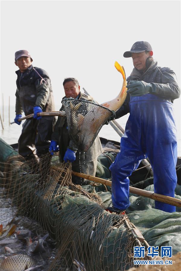 12月17日,江苏省泗洪县临淮镇渔民在洪泽湖水面捕鱼。 新华社发(许昌亮 摄)